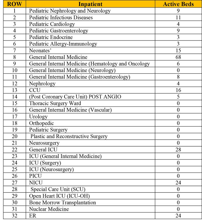 Men's and Women's Internal Medicine Department, Pediatric and Neonatal Department, Gynecological Surgery Department, Cardiology Department and CCUs 1 and 2, Dialysis Department, Operating Room, Infectious Diseases Department, Men's and Women's Psychiatry Department